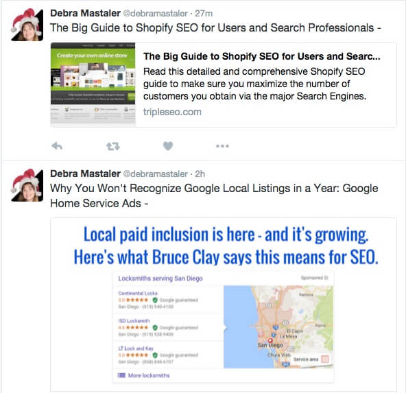 Başkalarının çalışmalarını paylaşmaktan gerçekten çok iyi temas kurdum. Bir ilişki kurmaya başlamak için harika bir yoldur. Aşağıdaki örneğe dikkat edin, diğer bağlantı geliştirici Debra Mastaler'in kendi insanını değil, başkalarının içeriğini tweetlemesi. Bu parçalarda da bahsedilmediğinden, onun yapmasının önemli bir yararı yok. Onun stilini beğendim.