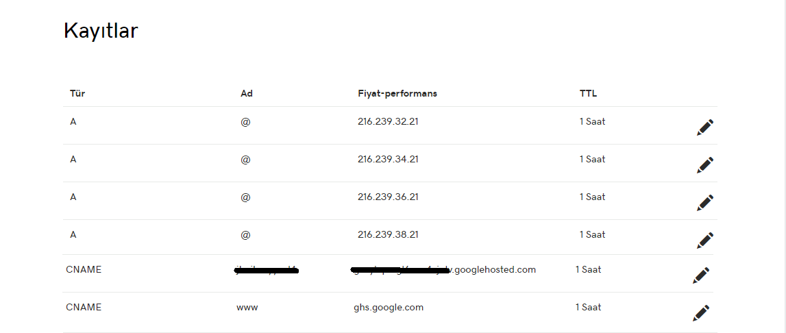CNAME yazan yerde www @ olan yeri @ yani yönlendirilen yeri ghs.google.com ile değiştiriyoruz.