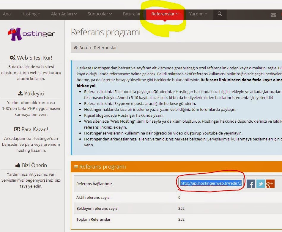 Resimde gösterdiğim gibi “Referans bağlantınız” adresini alın ve yayabileceğiniz yere yayın. Üye olan kişi başına 1$ gibi bir para kazanabilirsiniz fakat linkinizle üye olanlar site kurmalılar ve bu siteyi aktif olarak kullanmalılar.