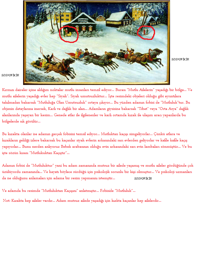 Resimde kırmızı daireler içine aldığım bölümler işte adamın gerçek fobisidir... Mutlu aile tablosu ve fobisi "Mutluluk"... Ve profesörün dediği gibi "Ayrıntılara takılmayın, resmin bütününü görmeye çalışın. Eğer tüm cisimler kaldırılırsa resim neye benzer, onu düşünün."Resimdeki tüm objeleri olduğu gibi ele alarak tüm herşeyi ortadan kaldırdığımızda dairedekiler göze çarpar...İşte buda Mutlu aile tablosu... Ve fobi de "Mutluluk" ...
