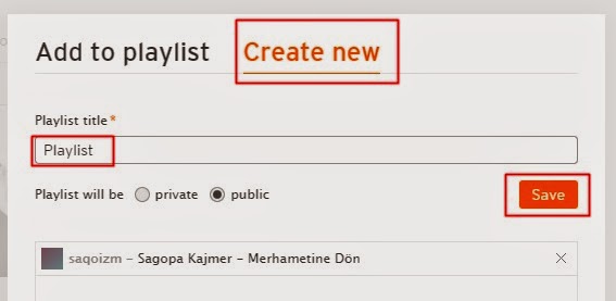 4- Daha önce müzik listesi oluşturmadığınız için önce playlist oluşturuyoruz. Create new'e basıyoruz playlist ismi yazıp Save'e basıyoruz. Webabisi