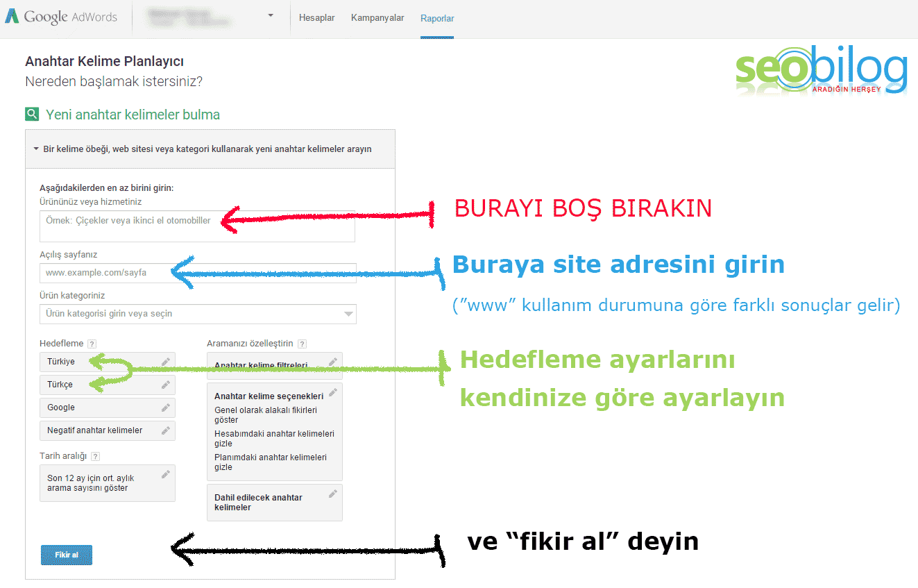 Oh be. Hele şükür sonlara geldik. Açıklaması uygulamasından sordu. Önce Google Anahtar Kelime Planlayıcı aracına girip, ilgili yerleri aşağıdaki gibi doldurun.