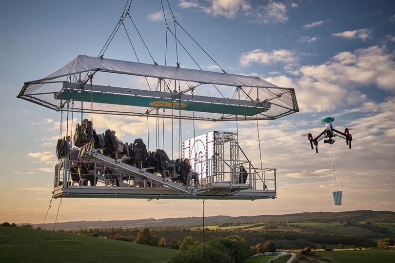 Yerden 30 metre yükseklikte bir vincin yardımı ile duran sinema salonunda patlamış mısır servisini drone'lar (İnsansız Hava Araçları) yapıyor.
