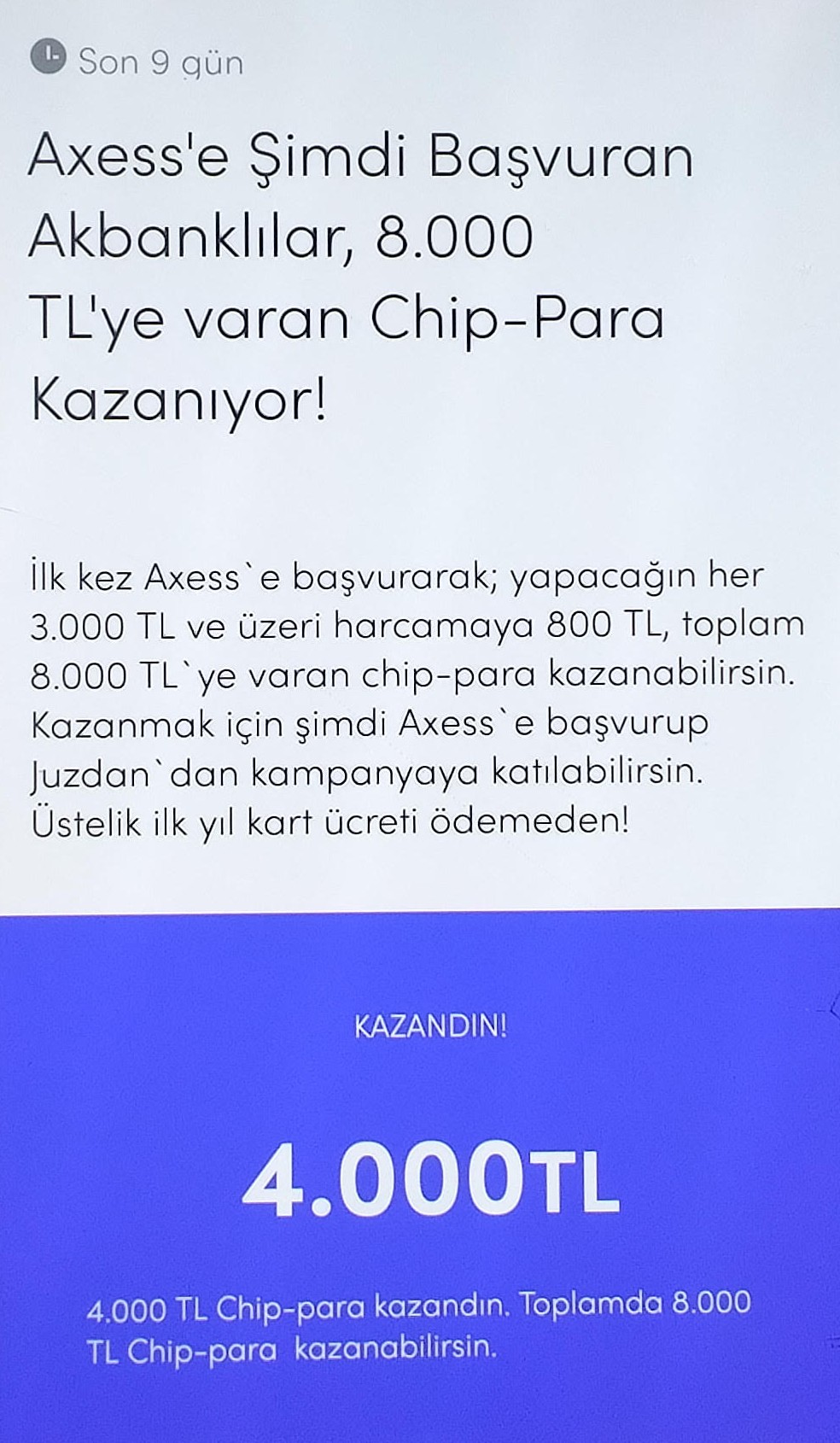 Ek: Akbank'ta ilk kredi kartına özel %0 faiz ile 25.000 TL 3 taksitli nakit avans. Her 3000 TL'lik harcamaya 800 TL chip para ödülü. (Toplamda 8000 TL Chip para, cüzdana yüklemeler vb. geçerli.)
