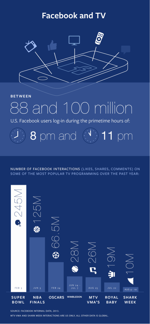 Facebook'ta tam bu noktada TV network'ü ve ağları için iki yeni API'sini duyurdu. “Keyword Insights” ve “Public Feed” adını taşıyan bu iki API ile TV kanalları gerçek zamanlı Facebook etkileşimlerini yayınlarına taşıyacaklar. Facebook bildirisinde, istatistiki verileri de paylaştı. Bu verilerden yola çıkara neden Tv'ye ağırlık vermek istediklerini anlayabiliriz. Aşağıdaki incelerseniz, akşam 8 ile 11 saatleri arasında yayınlanan prime time programları sırasında 88 ile 100 milyon ABD’li Facebook kullanıcısı sitede online oluyor. Önemli canlı etkinlikler sırasında Facebook’taki paylaşım, beğeni ve yorumlarla oluşan etkileşimleri de açıklayan sosyal medya devi Super Bowl sırasında bu etkileşim sayısının 245 milyon olduğunu söyleyerek diğer etkinliklerden örnekler veriyor.