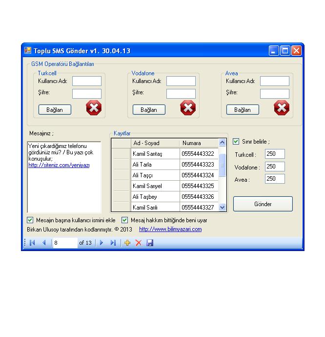 Program sizin hattınızdan sizin aldığınız 10000 sms paketlerini kullanarak toplu sms göndermeye imkan sağlamaktadır. Programın en büyük artısı smsi göndermeden önce sorgulatarak operatorunu öğreniyor ve o operatör üzerinden sms olarak gönderiyor. Böylece kullanıcı smsini operatör içinde göndererek çok büyük tasarruf sağlıyor.