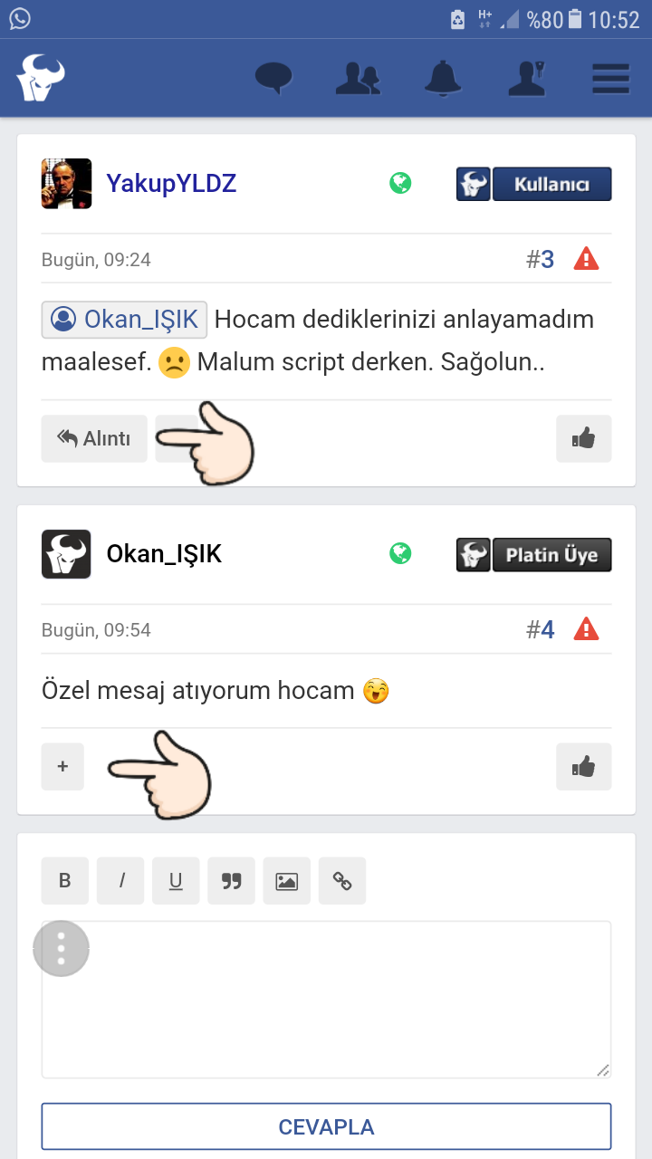 Alıntı butonunda sorun yok, masaüstü temada olduğu gibi çalışıyor fakat mobilde etiketleme kısmında küçük bir sorun var. Kullanıcı adları ikinci karakteri yazdıktan sonra çıkmaya başlıyor, bu sorunla ilgileneceğiz en kısa zamanda.
