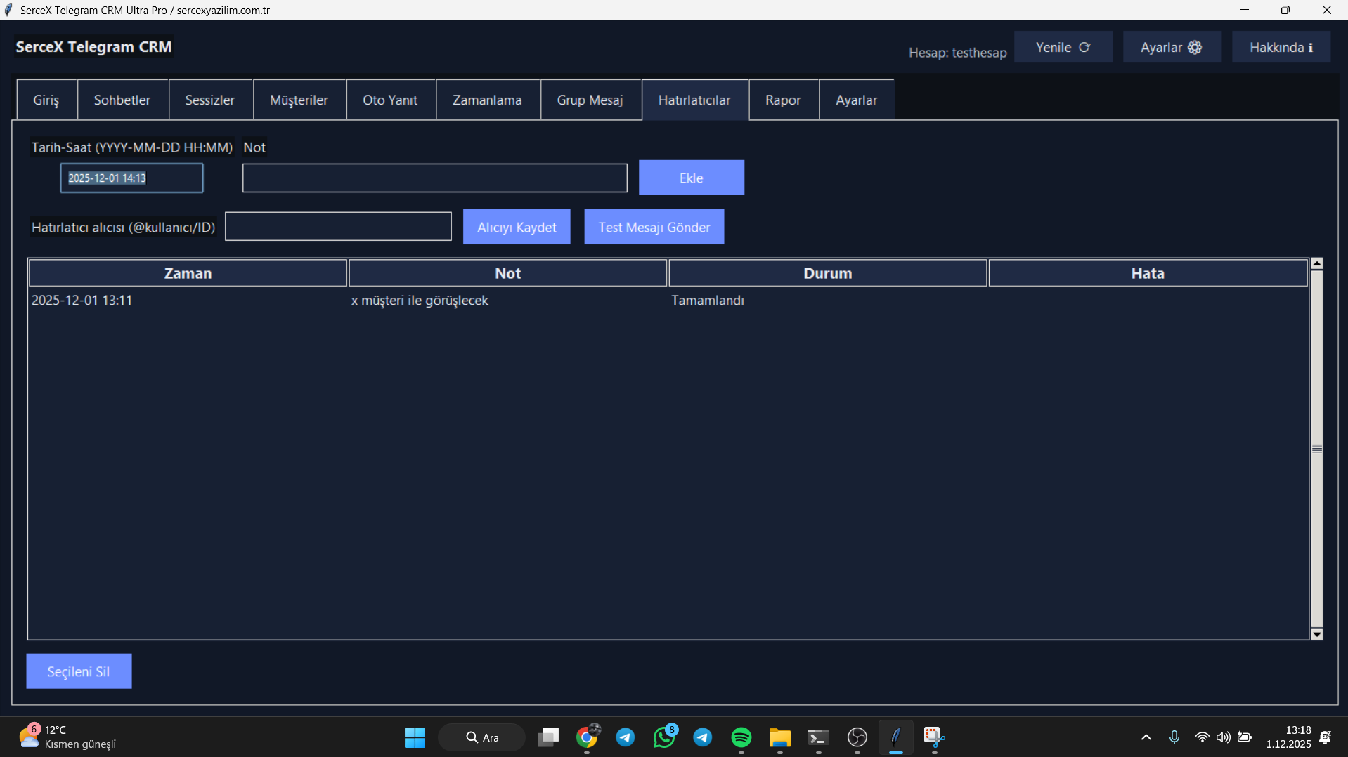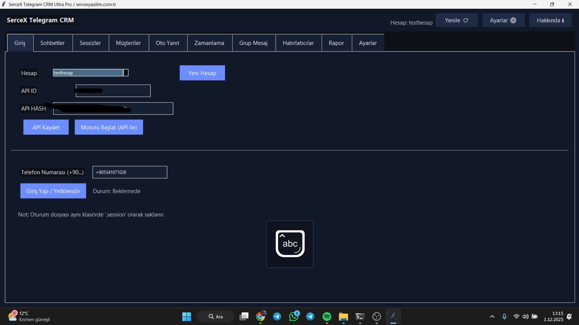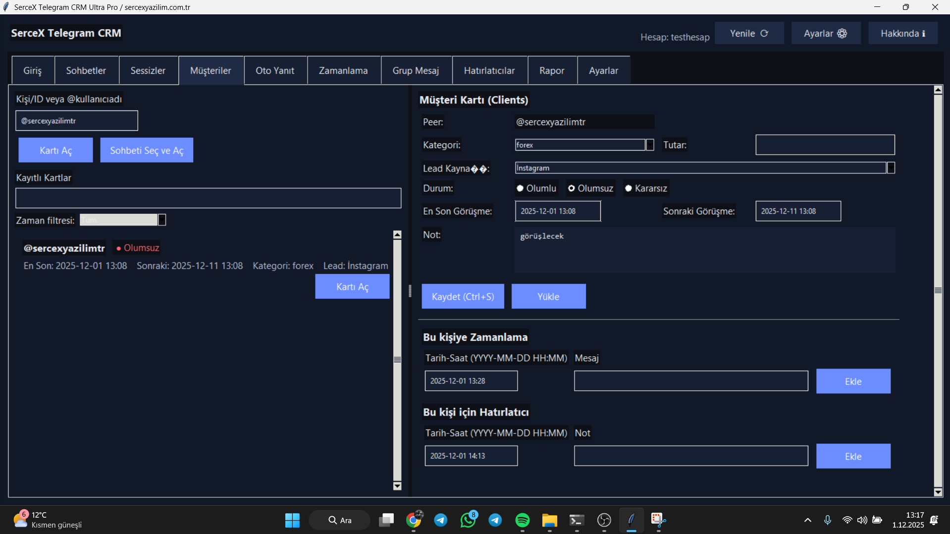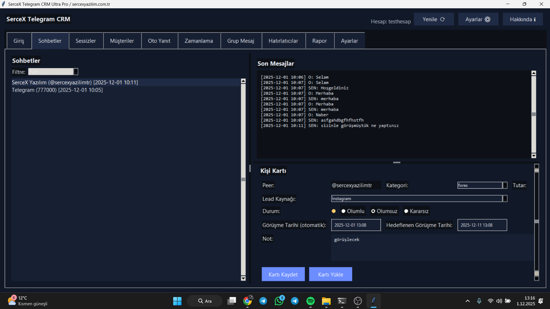 telegram crm, telegram crm programı, telegram crm yazılımı, telegram müşteri yönetimi, telegram müşteri takip, telegram müşteri takip programı, telegram pazarlama, telegram marketing, telegram satış, telegram satış otomasyonu, telegram satış botu, telegram mass dm, telegram toplu mesaj, telegram toplu mesaj gönderme, telegram otomasyon, telegram bot, crm yazılımı, crm programı, müşteri takip yazılımı, müşteri takip programı, satış crm, satış otomasyon, marketing automation, dijital pazarlama, telegram pazarlama otomasyonu, e ticaret crm, sercex, sercex telegram crm, telegram lead, lead yönetimi, lead tracking, zamanlanmış mesaj, otomatik mesaj, otomatik cevap, oto yanıt sistemi, telegram oto yanıt, hatırlatma sistemi, müşteri hatırlatma, python telegram crm, keyauth lisanslama, telegram freelancer aracı