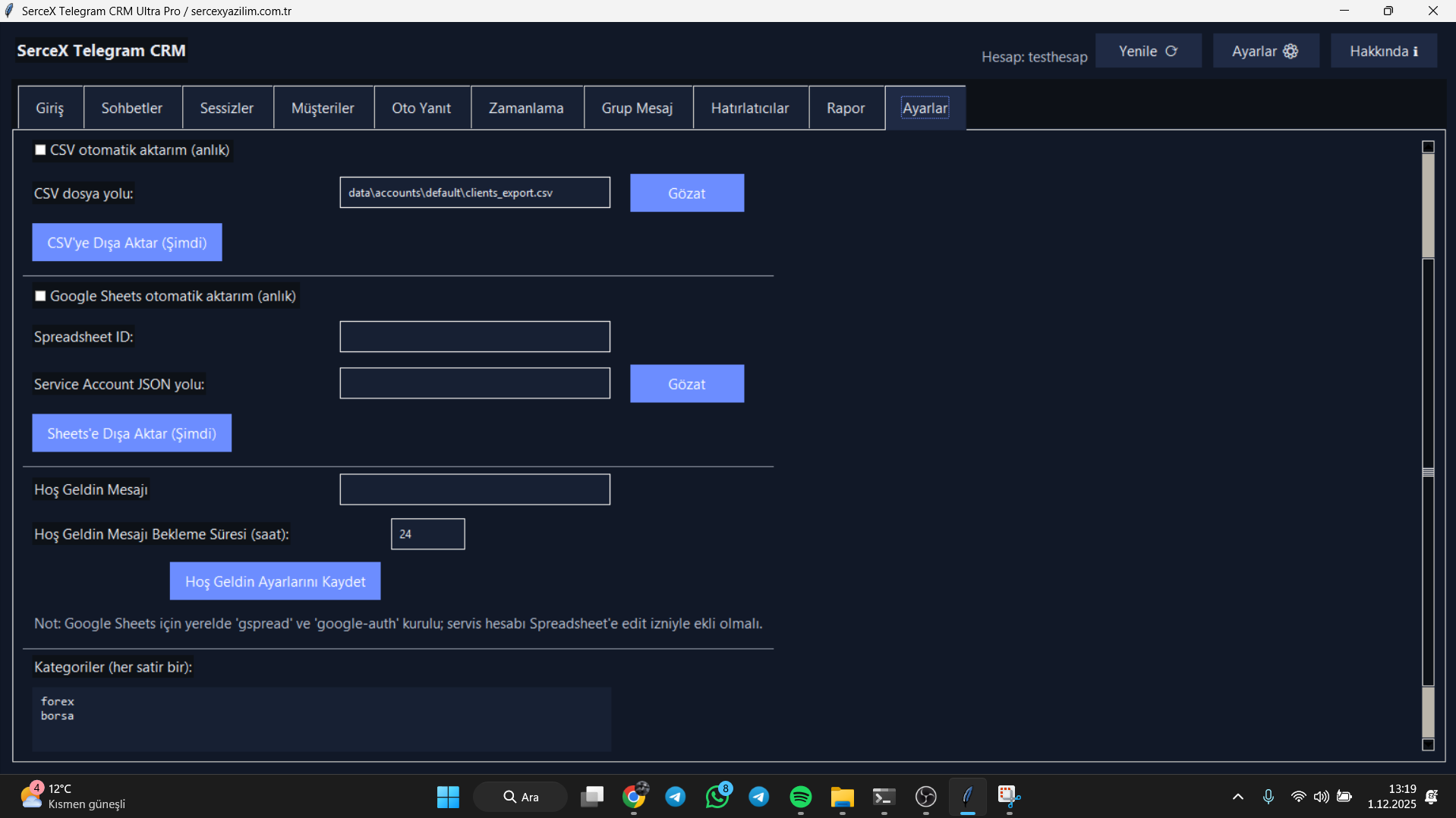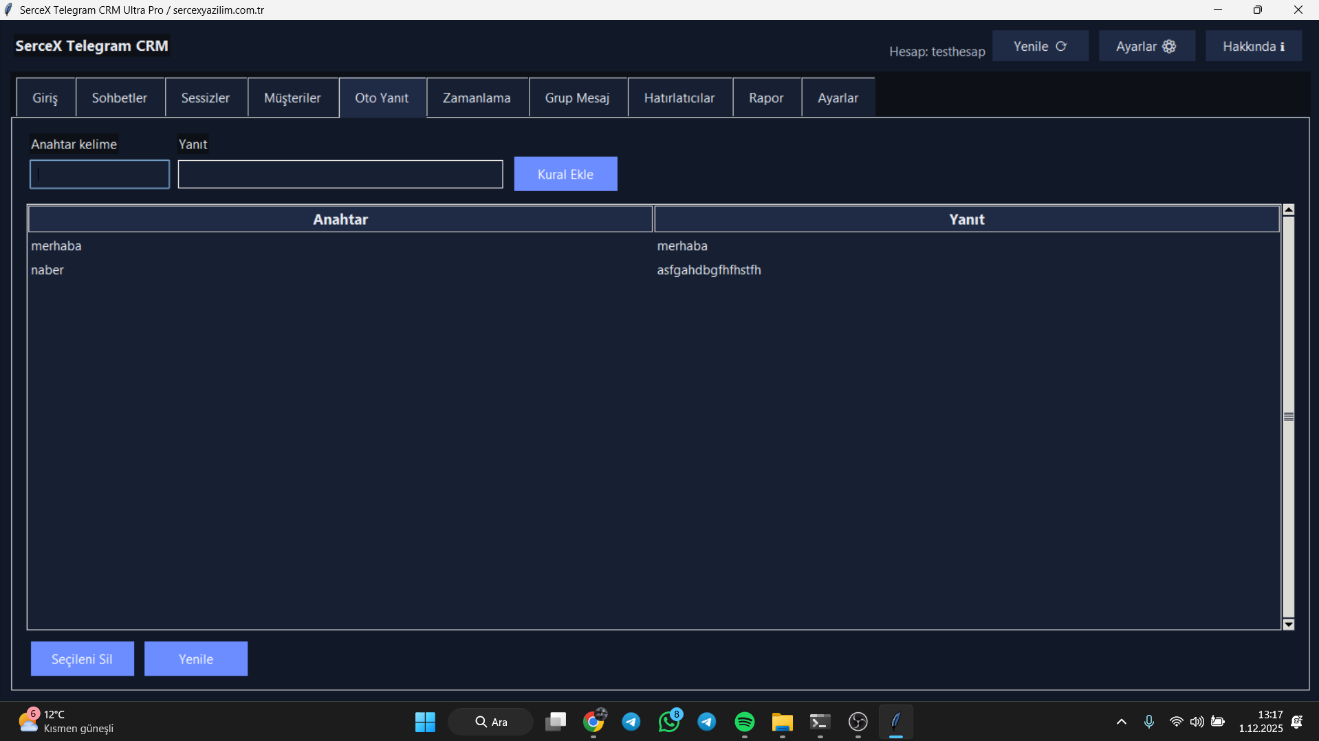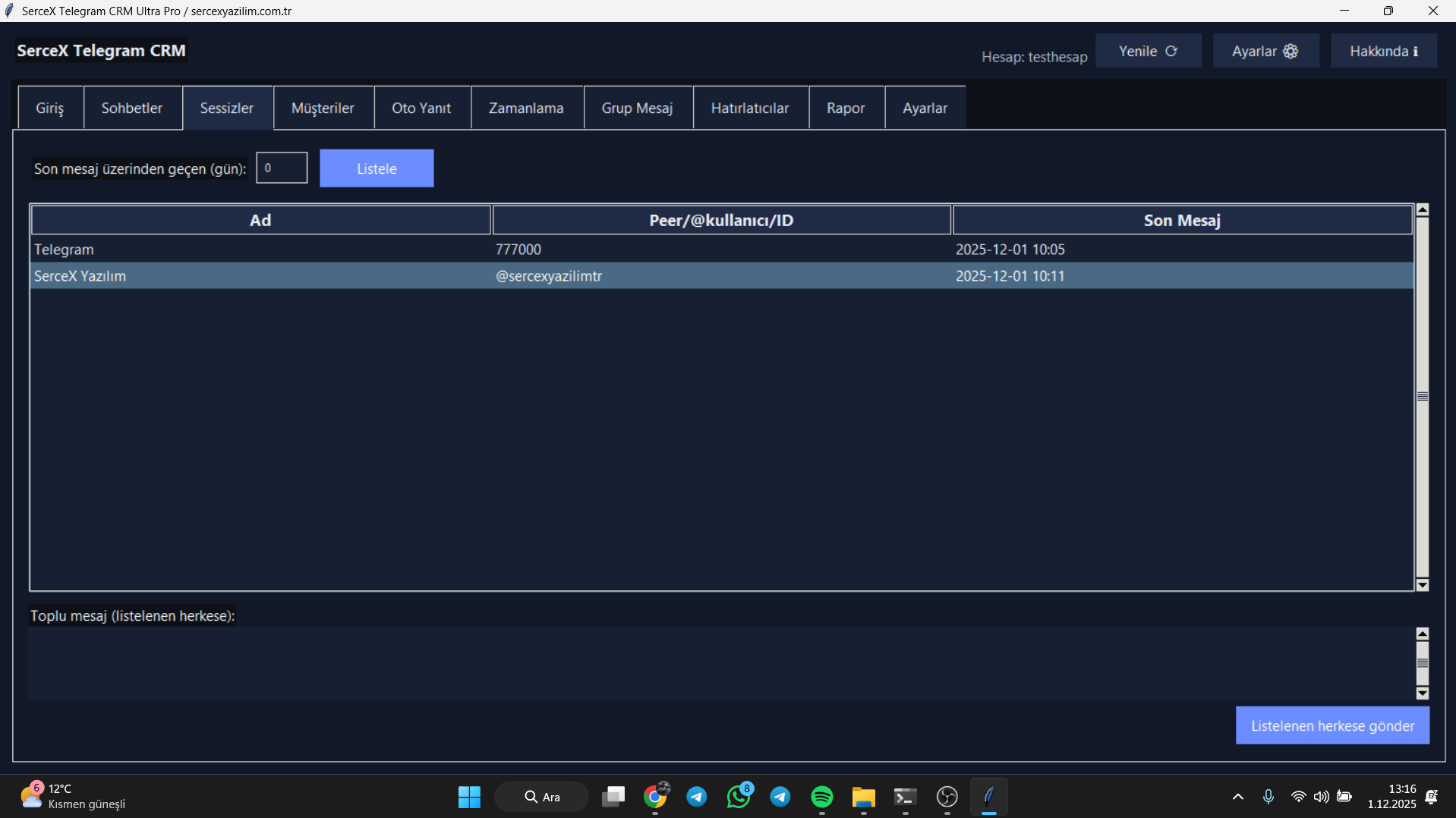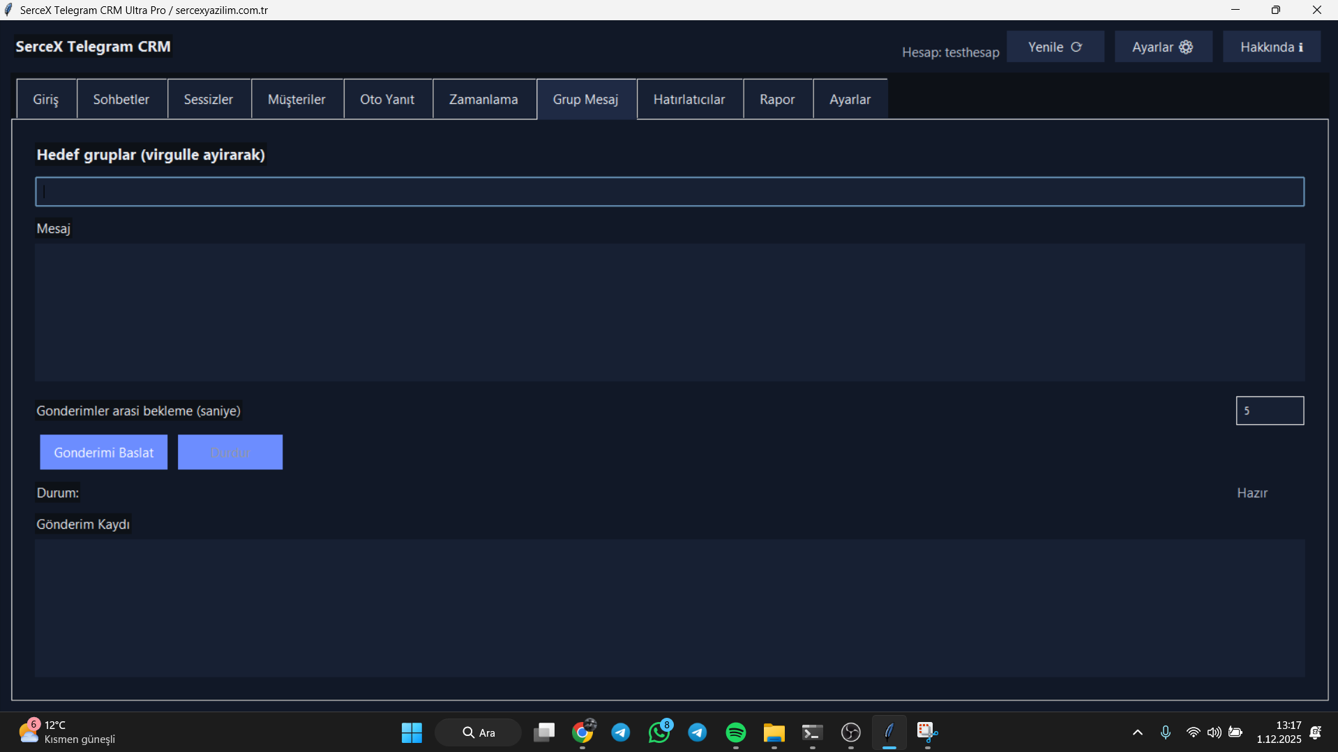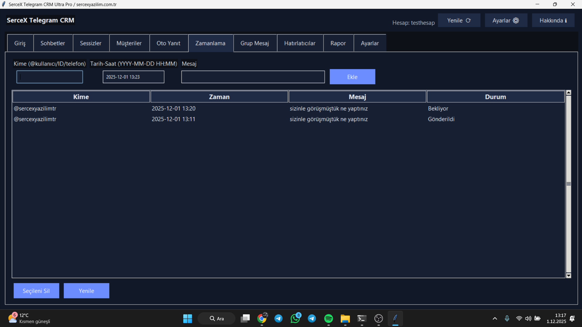 telegram crm, telegram crm programı, telegram crm yazılımı, telegram müşteri yönetimi, telegram müşteri takip, telegram müşteri takip programı, telegram pazarlama, telegram marketing, telegram satış, telegram satış otomasyonu, telegram satış botu, telegram mass dm, telegram toplu mesaj, telegram toplu mesaj gönderme, telegram otomasyon, telegram bot, crm yazılımı, crm programı, müşteri takip yazılımı, müşteri takip programı, satış crm, satış otomasyon, marketing automation, dijital pazarlama, telegram pazarlama otomasyonu, e ticaret crm, sercex, sercex telegram crm, telegram lead, lead yönetimi, lead tracking, zamanlanmış mesaj, otomatik mesaj, otomatik cevap, oto yanıt sistemi, telegram oto yanıt, hatırlatma sistemi, müşteri hatırlatma, python telegram crm, keyauth lisanslama, telegram freelancer aracı