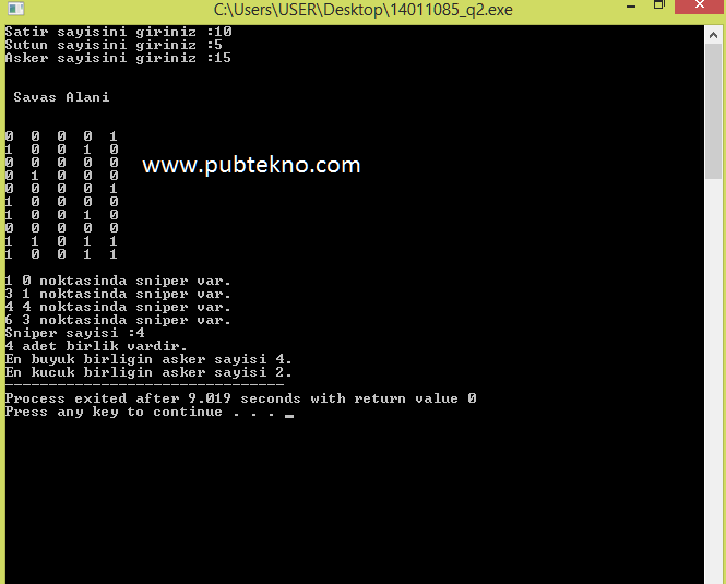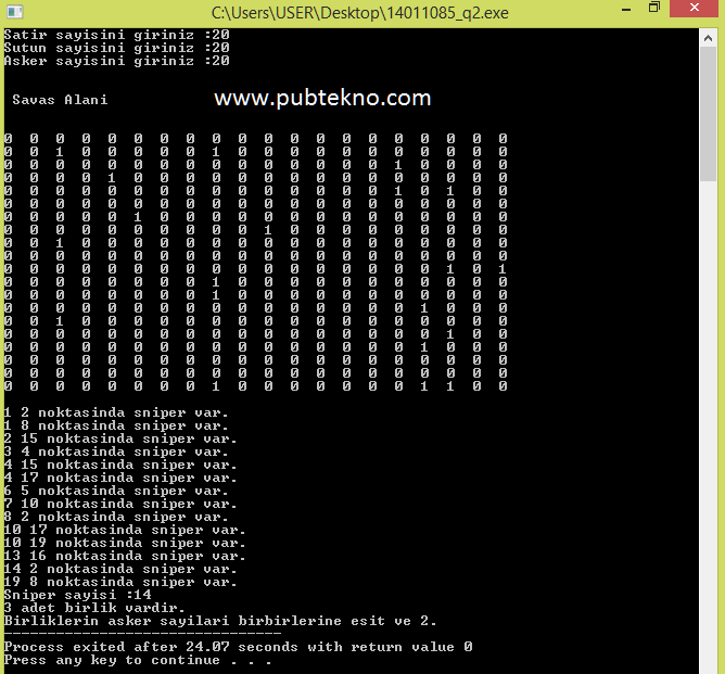 Çözüm: Kullanıcıdan satır, sutun ve asker sayısını aldım. Daha sonra while döngüsü içerisinde asker sayısı kadar rastgele yerlere 1 sayısı atadım. Oluşturduğum matrisi ekrana yazdırdım. Daha sonra matristeki her bir elemanın 1 e eşit olup olmadığını kontrol ettim. 1 e eşit olanlar oluşturduğum x fonksiyonu içerisinde önce daha önce kontrol ettiğimi belirtmek için kontrol matrisindeki aynı yerinin değerini 1 yaptım. Daha sonra etrafını (3x3 lük kısmı) başka bir varmı diye kontrol ettim for döngüsü ile.Eğer yoksa sniper olarak ekrana koordinatları ile beraber yazdırdım. Eğer varsa for döngüsü içerisinde x fonksiyonunu tekrar çağırdım ve her seferinde kontrol matrisinin aynı koordinatlardaki yerini 1 yaptım. Bulduğum 1 sayılarını troop adında bir diziye atadım. Daha sonra troop dizisinde değeri 1 olan elemanları çıkarıp realtroop adında bir matrise atadım ve bu matrisin en buyuk ve en kucuk elemanlarını ve toplam eleman sayısını bulup ekrana yazdırdım.
