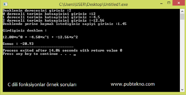Örnek: C dilinde kullanıcının girdiği sayıyı yine kullanıcının girdiği dereceleri tam sayı olan polinom fonksiyonunda yerine koyan program.
