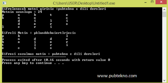 Aşağıda "pubtekno c dili dersleri" metni ve "pubtekno" metni için yaptığımız şifrelemeyi görüyorsunuz. Gördüğünüz gibi şifreli metnin herhangi bir şifre çözme tekniği kullanılmadan anlaşılmasına imkan yok.