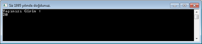 Yukarıda ki kodumuzda ise bulunduğumuz yıl olan 2015'ten 'yasDegiskeni' adlı değişkenimize girilen değeri çıkartma işlemi yaptık. Bu sayede 2015-20=1995 sonucunu elde etmiş olduk. C# Dilinde metinsel ifadelerde birleştirme işlemi '+' operatörü ile yapılmaktadır. Bu kodların sonucuna göre ekran çıktımız şu şekilde olur: